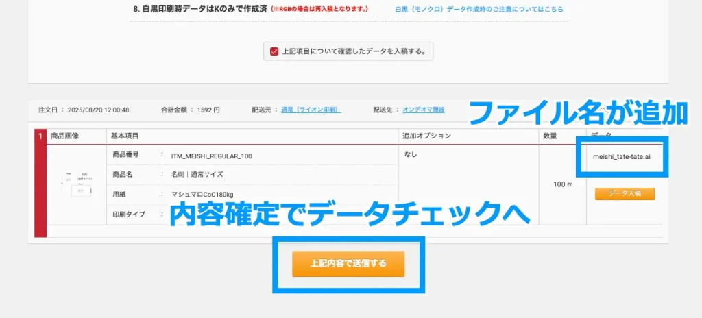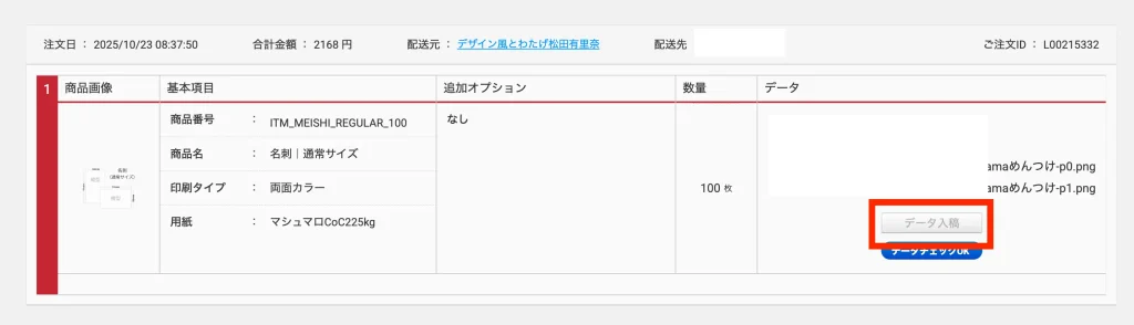 「データ入稿ボタン」をタップし、印刷データをアップロード。