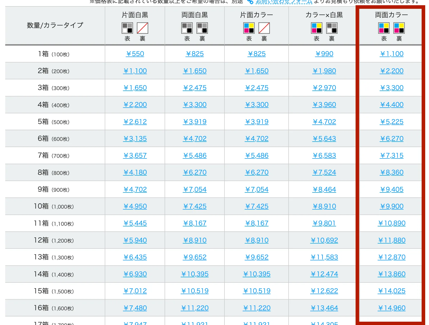 印刷枚数をお選びください。(両面カラーを選んでくださいね!)