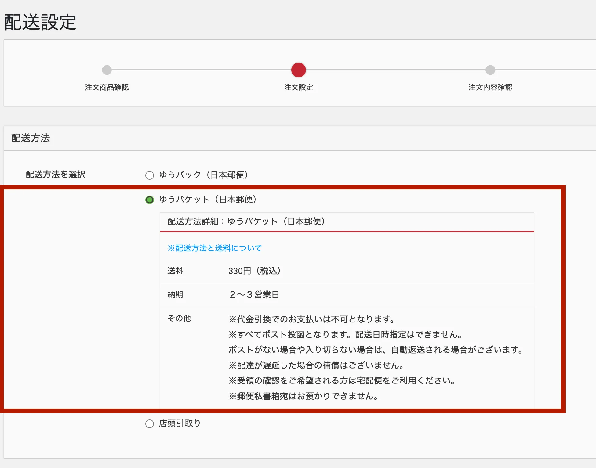 配送方法は「ゆうパケット 330円税込」のほうがお得です!